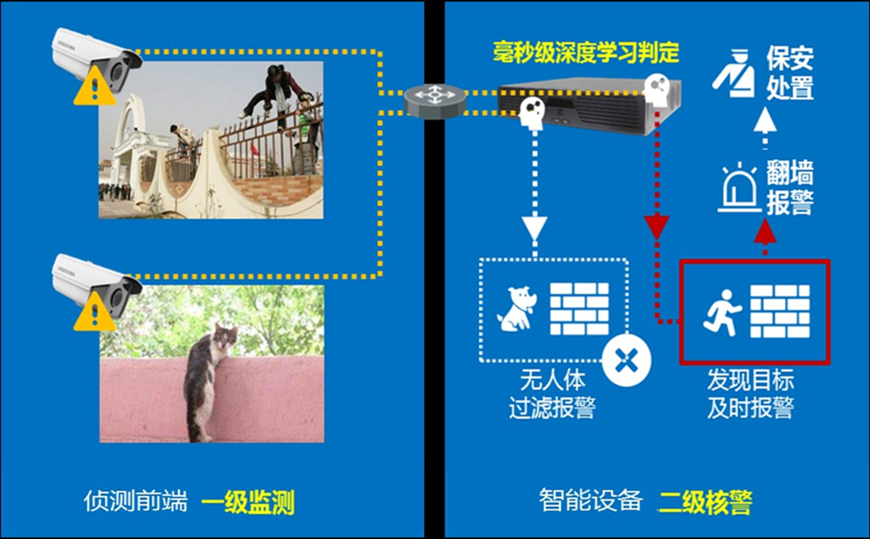 為了防止大樓周界低層區(qū)域有人翻越或攀爬進(jìn)入,校園周界防范需要及時(shí)發(fā)現(xiàn)并預(yù)警越界行為,以便安保人員快速響應(yīng)處理,我們為解決可見光視頻周界防范存在誤報(bào)較多的困擾,一是采用警戒系列IPC,在檢測(cè)周界非法入侵的同時(shí),將前端設(shè)備接入NVR,進(jìn)行二次識(shí)別,有效過(guò)濾絕大部分非人體觸發(fā)的報(bào)警,提高報(bào)警準(zhǔn)確率。